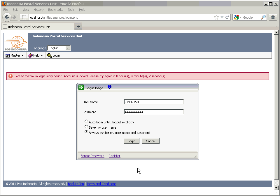 Unfortunately, if the user is still trying to login after he/she got that warning message, then the system will keep inform him/her about the "5 minutes" again and again. I think this message is not so smart, because that "5 minutes" message should be updated automatically in accordance with the real time at that time. So, instead of saying "5 minutes", we will make it auto-adjust to the real time. The result will be like this: